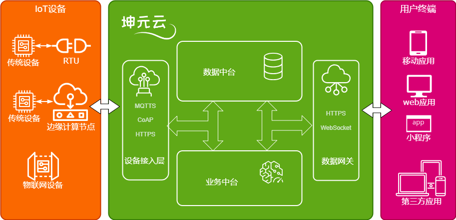 我们不仅仅提供软件服务,而是一套完备的解决方案。以坤元云为核心的,包含多种物联网设备及用户端应用的完备系统。同时提供业界标准接口,可以方便的将我们的系统全部或部分部分整合到用户系统当中。